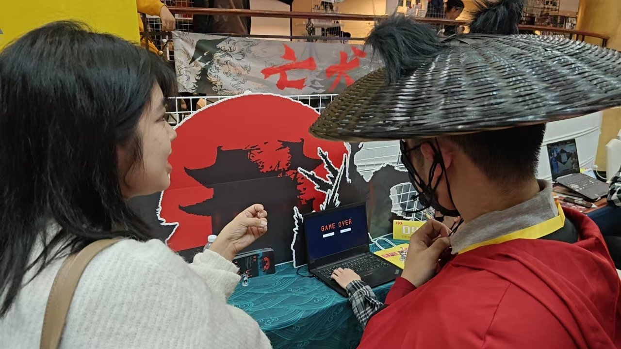 这是我们的游戏像素风类银河恶魔城亡犬deaddog线下试玩会时,主程序伊凡cos的主角,我们的游戏是武侠风格的世界观,主打玩法是潜行暗杀,过几天还会发点试玩会的图。