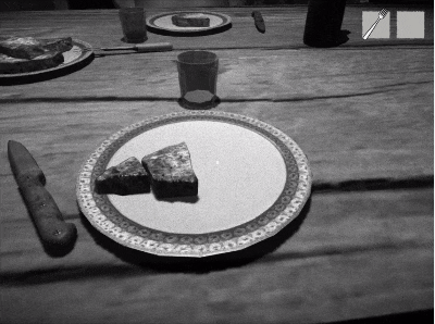 游戏里,有个片段是男主在桌前切一只烤鸡,可每切一下,烤鸡就发出尖叫鸡般的惨叫。这片段,就让人想起《橡皮头》里切烤鸡,烤鸡变活的一幕。