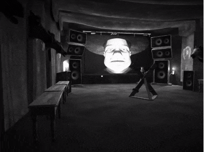 当你进入洗脑房间时,起先农场主的脸只在幕布上,其话语只是底端字幕。可很快,他的脸和话语就会占据你的整个屏幕——游戏用默片的方式,将被洗脑的主体,从“母马”变成了玩家。