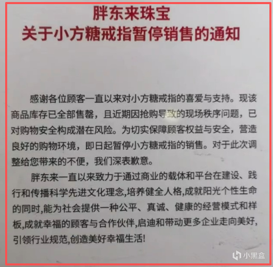 12 月 7 日,胖东来珠宝发布通知,宣布即日起暂停销售小方糖戒指。