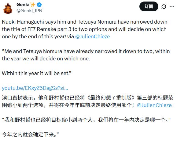 在近期《最終幻想7 重生》總監濱口直樹與《光與影:33號遠征隊》總監紀堯姆·布羅什共同接受朱利安·奇澤的採訪中(經由X用戶Genki_JPN轉述),濱口透露他與創意總監野村哲也已將第三部標題範圍縮小至兩個選項,將於年底前做出最終決定。"我們已篩選至兩個選項,將在今年內確定最終標題。"