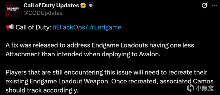 除此之外,Endgame(终局)还修复了少一个武器配件的问题,如果玩家在游玩的过程中还出现这个bug,就需要重新创建武器配置再试试了。