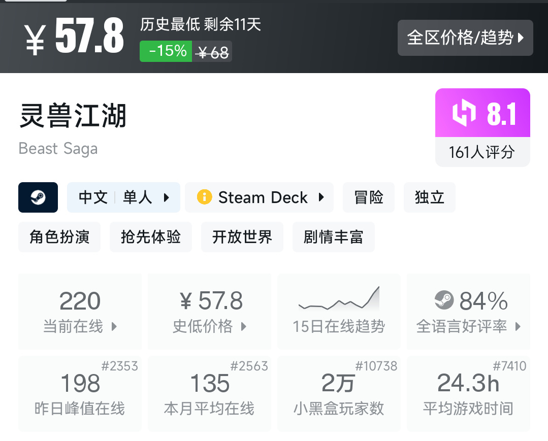 一款開放世界靈獸武俠RPG遊戲。體驗自由探索、採集製造、生活技能、武學內功、結交俠客以及江湖奇遇等特色玩法,在非線性無限制開放式劇情的抉擇中,每一步都將成就獨屬於你的江湖傳說。