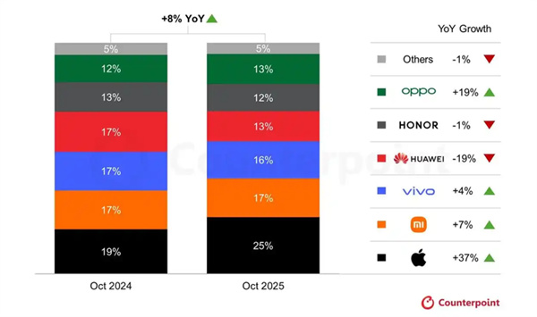 能讓蘋果官方主動降價,iPhone 17 Pro系列的實力絕對毋庸置疑!不久前根據CounterpointResearch的最新報告,10月蘋果在中國智能手機市場的銷量佔比飆升至25%,意味着每售出4部手機就有1部是iPhone,這樣的成績僅在2022年出現過一次,足以見得消費者對它的認可。
