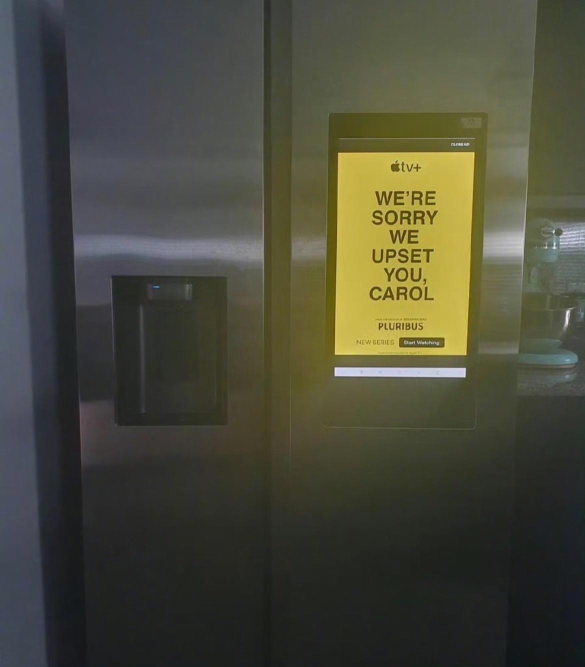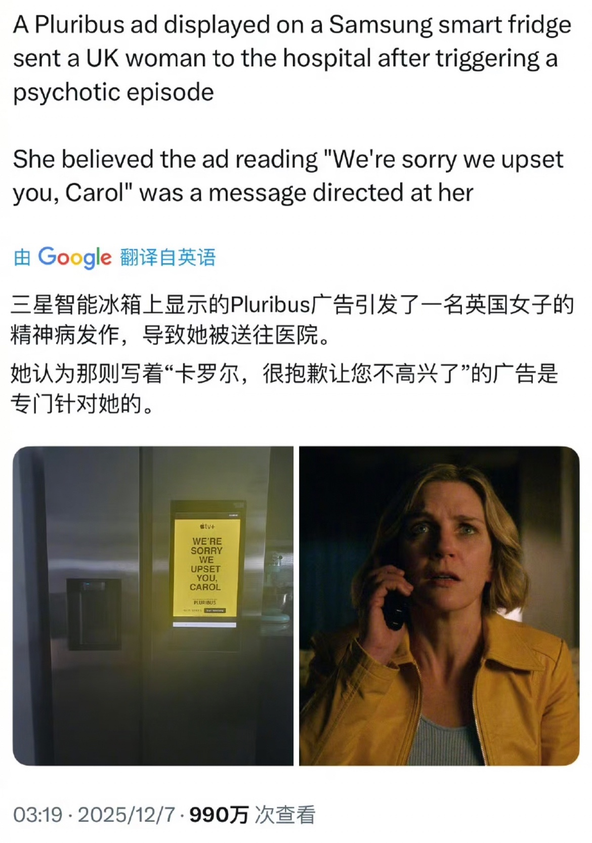 《絕命毒師》製作人文斯·吉利根的新劇《同樂者》的廣告突然在智能冰箱上出現,把一名英國女生直接嚇到精神崩潰,被送進醫院。