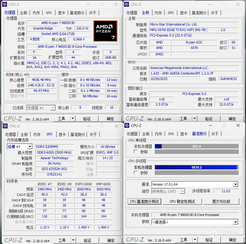 爲了全面檢驗微星 MPG X870I EDGE TI EVO WIFI 的實際性能,我們搭建了一套主流測試平臺,處理器選用 Ryzen 7 9800X3D,顯卡爲RTX 5070Ti,內存搭配兩條 16GB DDR5 6000MT/s 內存,硬盤選用 PCIe 5.0 NVMe SSD,操作系統爲 Windows 11 專業版。