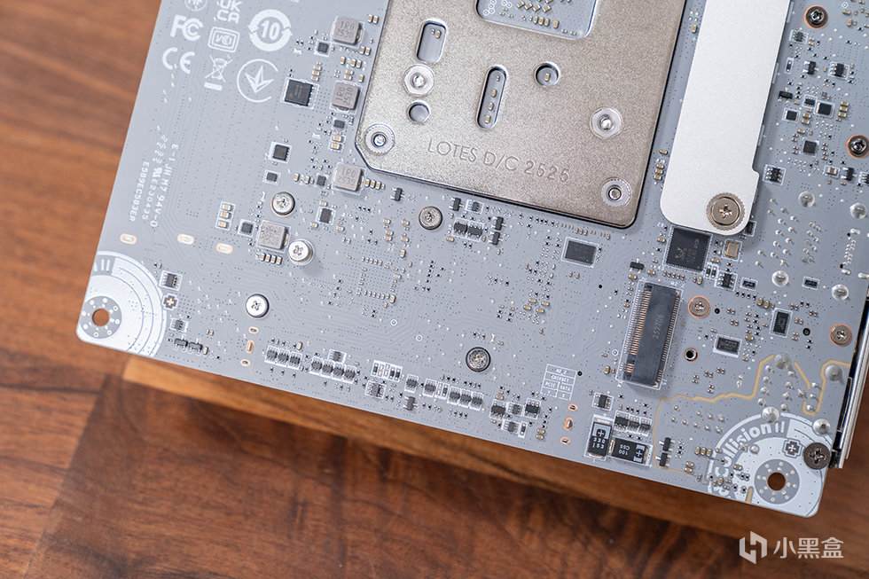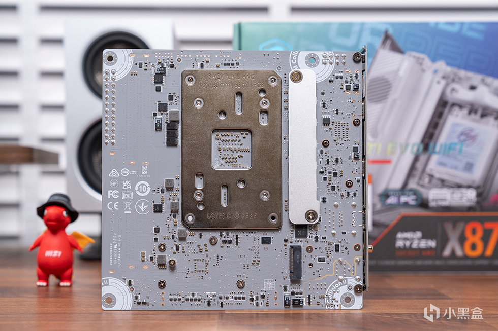 主板正面覆蓋大面積金屬散熱片,內部嵌入一顆低轉速風扇,用於主動冷卻 VRM 與芯片組;主板背面採用灰色 PCB 塗裝,關鍵電路區域不僅標註了螺絲鎖點的避讓提示,還覆蓋了保護漆,有效防止裝機過程中組件被螺絲刮傷,細節處理十分到位。供電區域的背面還增設了獨立散熱片,與正面的散熱裝甲形成前後雙向散熱體系。