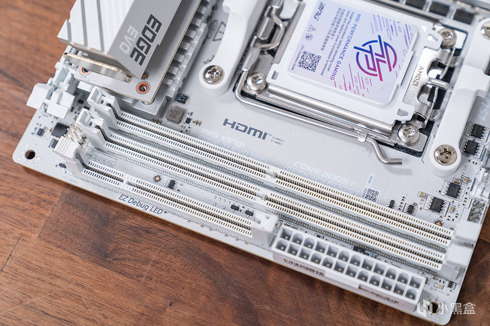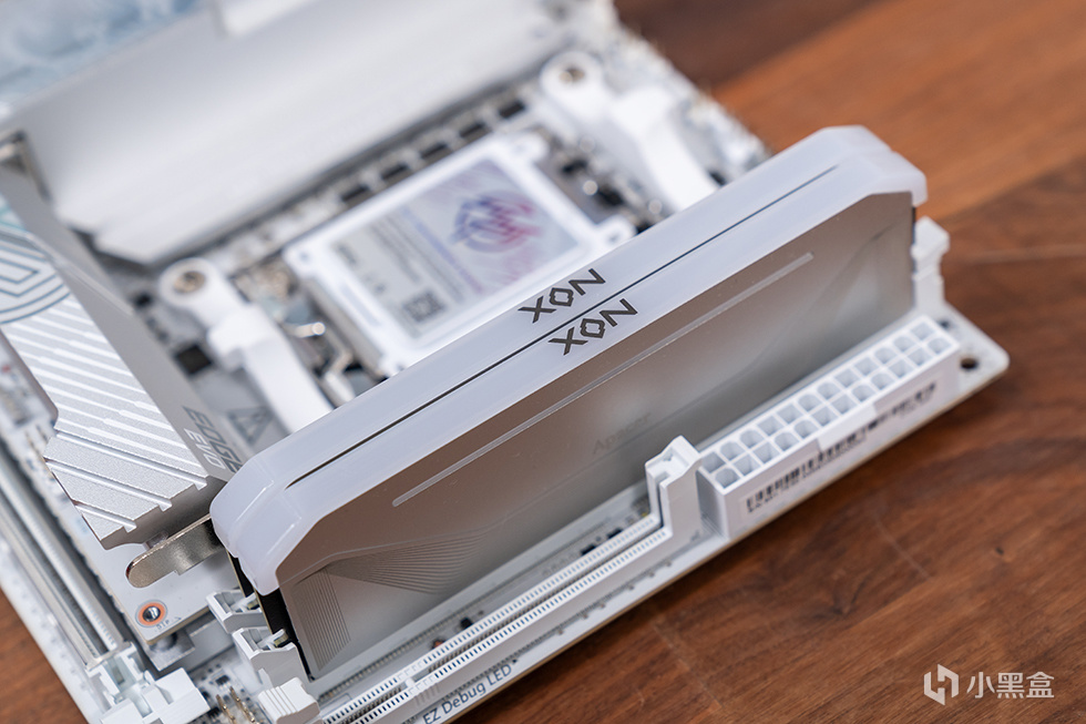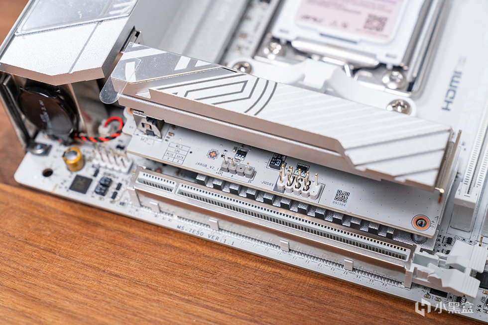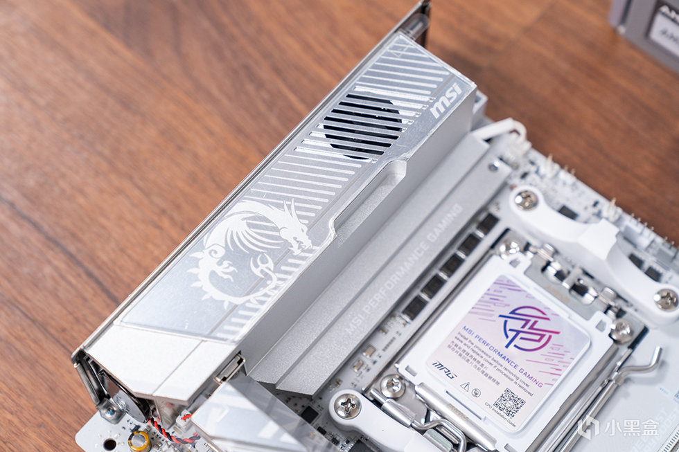 通體純白是 X870I 刀鋒鈦最直觀的視覺標籤。白色 PCB、白色內存插槽、銀白陽極氧化處理的散熱裝甲,甚至連 I/O 擋板與 SATA 接口都做了統一色調處理,呈現出高度一致的視覺語言。這種設計並非僅爲“好看”,更是爲了與當下流行的白色顯卡、電源及機箱形成和諧搭配,避免傳統黑色元件在淺色環境中造成的割裂感。