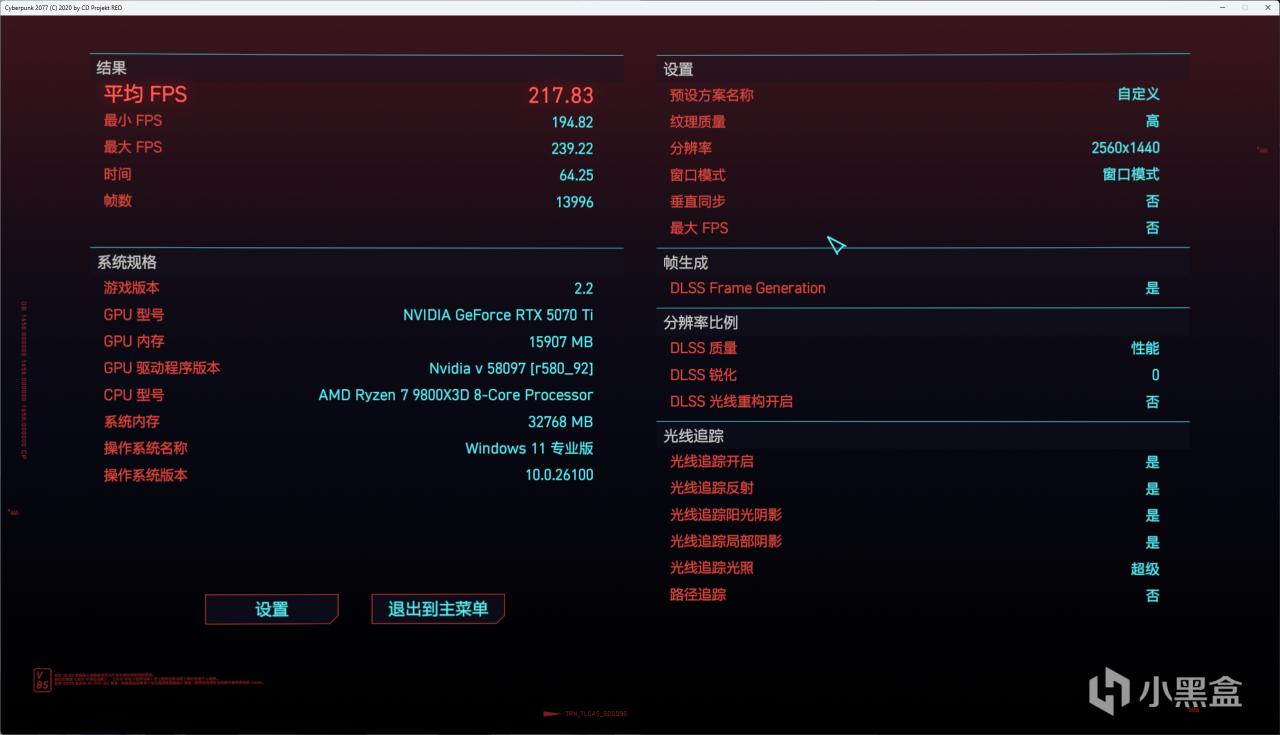 遊戲測試中,運行《賽博朋克 2077》4K 分辨率高畫質設置,平均幀率達到 217fps,內存和硬盤的高速傳輸有效減少了遊戲加載時間,供電系統的穩定則保證了遊戲過程中沒有出現幀率波動,整體遊戲體驗流暢出色。