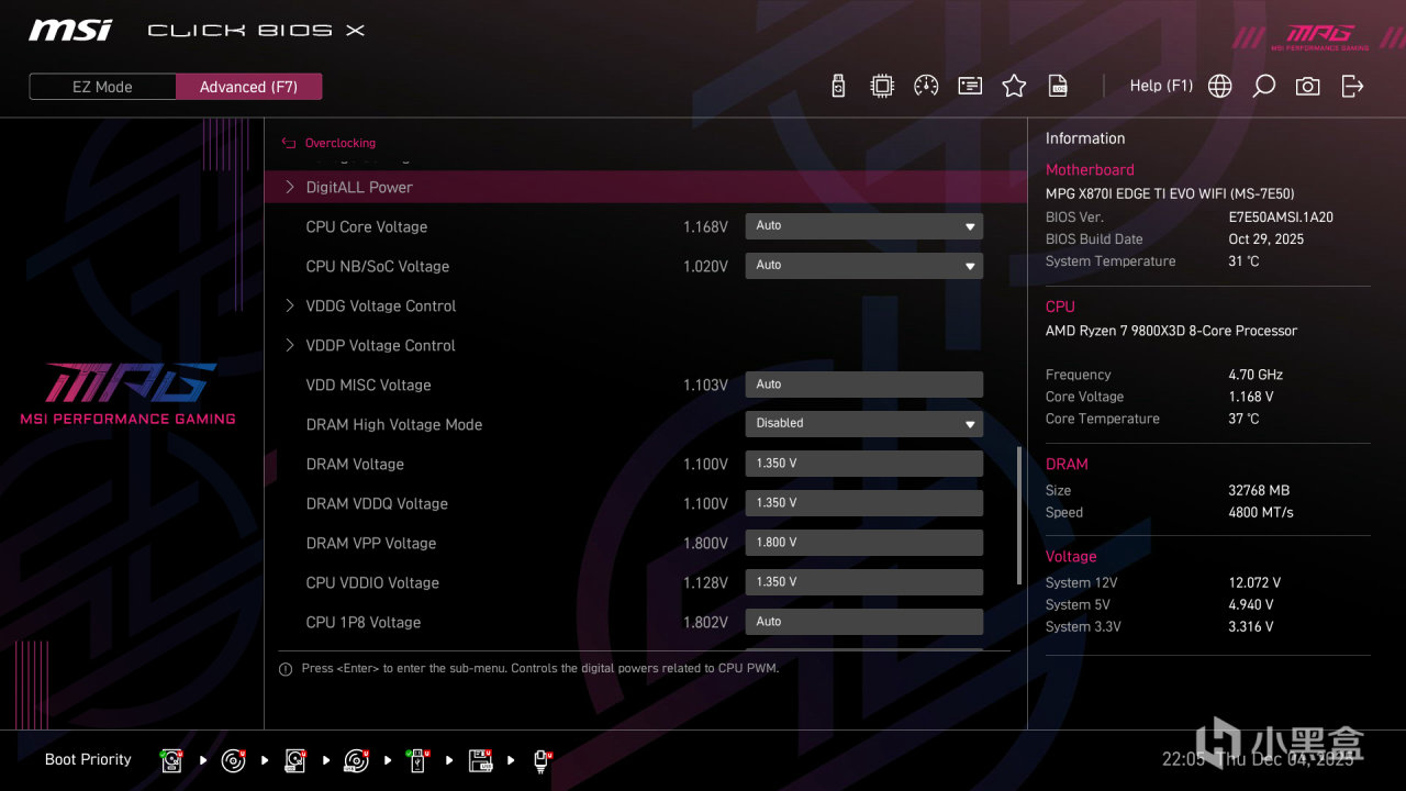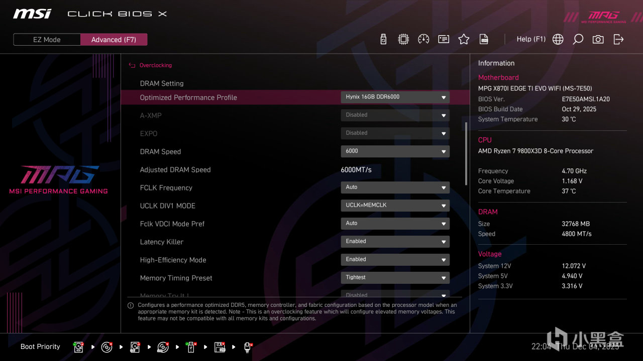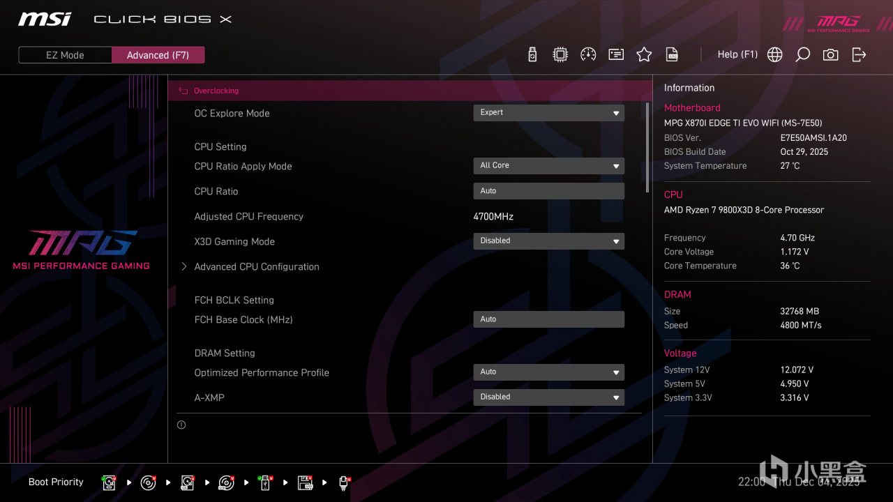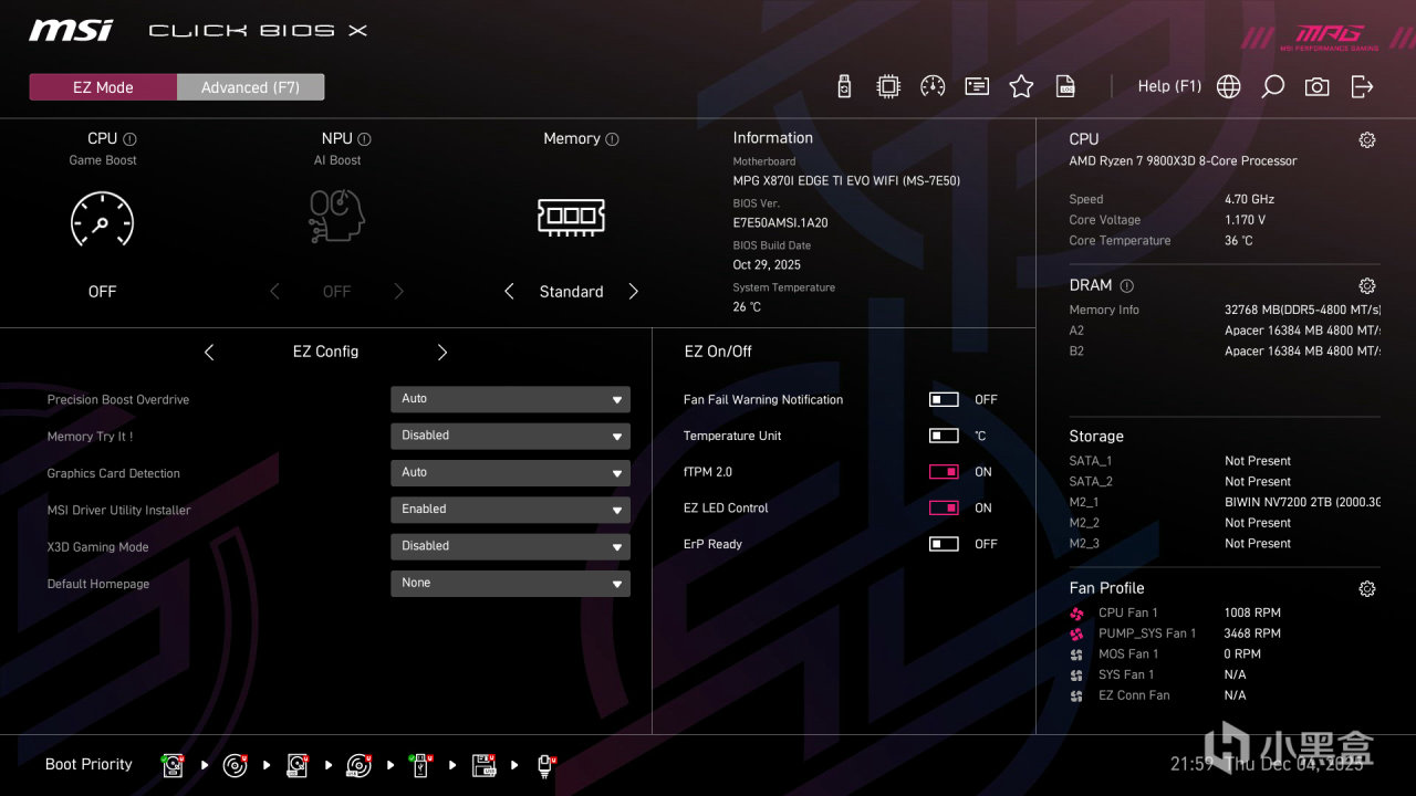 微星 MPG X870I EDGE TI EVO WIFI 搭載了最新的 CLCIK BIOS X 固件,配備 64MB 大容量 BIOS 芯片,不僅支持當前全系列 AM5 處理器,還能通過 BIOS 更新支持未來的 Zen 6 架構處理器,具備出色的兼容性和前瞻性。BIOS 界面分爲 EZ 簡易模式和高級模式,兼顧了新手用戶和資深玩家的使用需求。 EZ 簡易模式界面簡潔直觀,採用圖形化設計,主要顯示主板型號、處理器型號、內存頻率、溫度等關鍵信息,用戶可以快速開啓 PBO 超頻、XMP/EXPO 內存超頻、Memory Try It! 內存優化以及 X3D 遊戲模式等常用功能,無需複雜設置,即可獲得出色的性能表現。界面下方還提供了 BIOS 更新、風扇控制、啓動項設置等快捷按鈕,操作十分便捷。