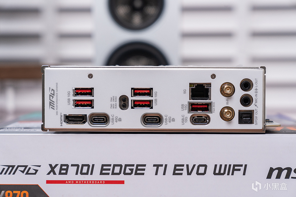 後置 I/O 配備了雙 USB4(40Gbps,支持 DP 輸出與外接顯卡塢)、1個 USB 10Gbps Type-C、5個USB 3.2 Gen2 Type-A、1個 HDMI 2.1、5GbE 網口、Wi-Fi 天線接口、S/PDIF 光纖音頻輸出,以及高清音頻接口。