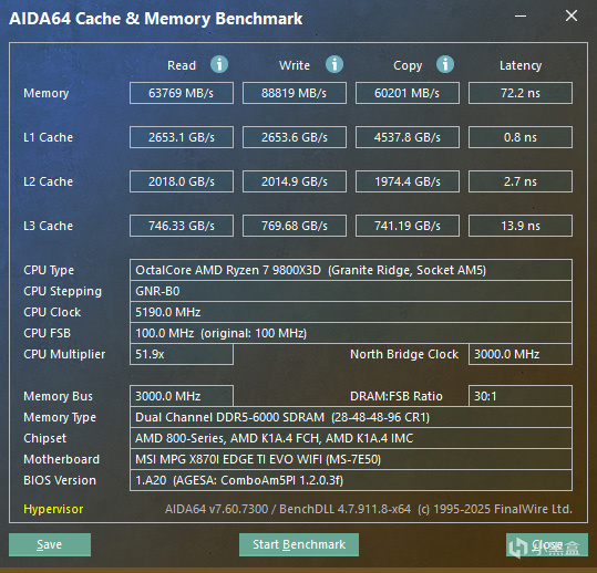 內存性能測試中,開啓 EXPO 後內存穩定運行在 6000MT/s,AIDA64 測試中讀取速度達到 63769MB/s,寫入速度 88819MB/s,延遲控制在 72.2ns 左右,表現穩定。