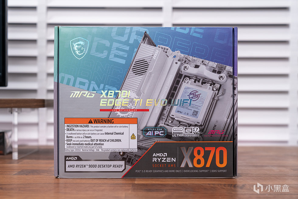 X870I刀鋒鈦主板的包裝承襲刀鋒鈦系列設計語言,整體呈現簡潔沉穩的設計基調。產品主視覺佔據右側大面積展示區域,正中央以鐳射工藝印刻產品型號名稱。下方標註有"AMD RYZEN 9000 DESKTOP READY"及"AMD X870"標識,包裝背面則詳細呈現產品核心特性與技術參數說明。