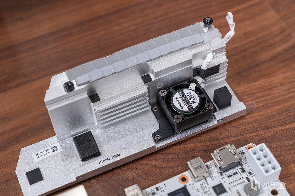供電區域配備了大面積鋁製散熱裝甲,內部填充高導熱硅膠墊,能夠快速傳導 MOSFET 產生的熱量。更值得一提的是,散熱裝甲內置了一顆 2.5cm 主動散熱風扇,支持智能啓停技術,當 MOS 溫度低於 65℃時風扇會自動停轉,避免不必要的噪音。