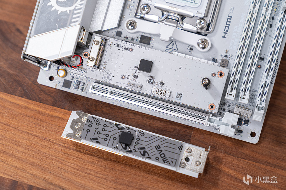 M.2 存儲擴展是這款主板的最大亮點之一,在如此緊湊的板型上,微星通過創新設計實現了三個 M.2 SSD 接口的配置。主板正面配備了一個 PCIe 5.0×4 M.2 接口,搭配第二代免工具散熱裝甲,能夠有效降低高速 SSD 運行時的溫度,保證傳輸速度穩定;主板背面亦配備一枚M.2插槽,該插槽採用PCIe 4.0 x 4協議,其帶寬由芯片組提供。兩個插槽均支持 2280規格。