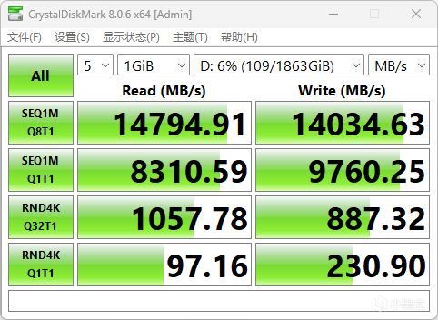 硬盤性能測試中,PCIe 5.0 SSD 在 CrystalDiskMark 測試中,順序讀取速度達到 14794MB/s,順序寫入速度達到 14034MB/s,接近硬盤的理論極限速度,相比在 PCIe 4.0 接口上的表現提升明顯,充分發揮了 PCIe 5.0 接口的帶寬優勢。