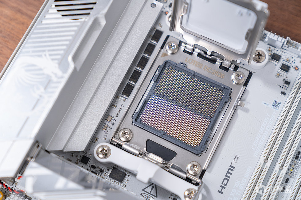 作爲面向 AM5 平臺的主板,X870I刀鋒鈦主板的 CPU 接口採用了標準的 AM5 LGA 1718 插槽設計,支持 Ryzen 7000/9000 系列全系列處理器,包括最新的 Ryzen 9000X3D 系列旗艦型號,同時通過 BIOS 更新,還能支持未來推出的 Zen 6 架構處理器。插槽周圍的設計十分合理,電容等元件佈局緊湊但不擁擠,爲 CPU 散熱器的安裝預留了充足空間,無論是下壓式散熱器還是小型水冷散熱器,都能輕鬆兼容,不會出現安裝干涉的問題。