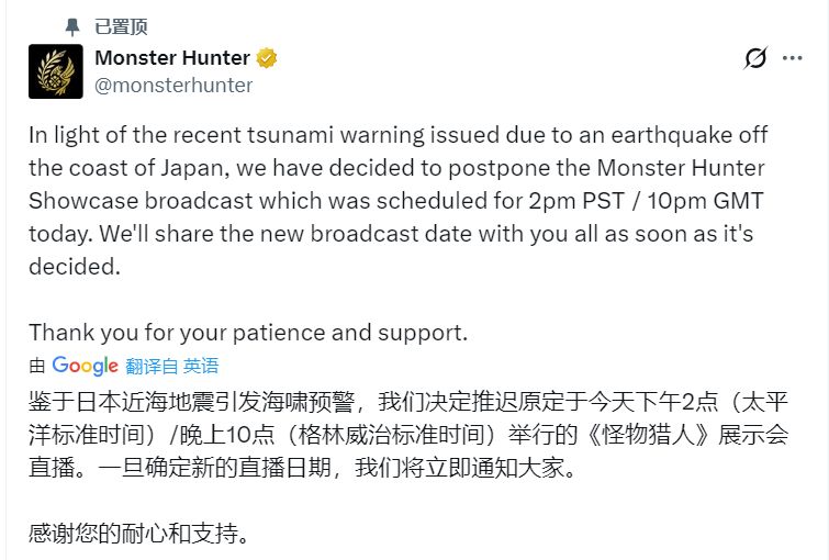 卡普空宣布,因日本近海地震引发的海啸预警,决定推迟原定今早播出的线上节目“Monster Hunter Showcase”,官方将在后续公布新的播出时间。