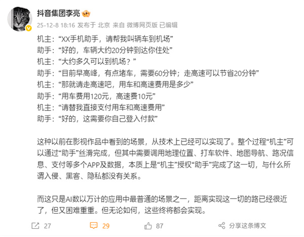 抖音副总裁李亮发文表示,“豆包手机”本质上是“机主”授权“助手”完成了这一切,与什么所谓入侵、黑客、隐私都没有关系。