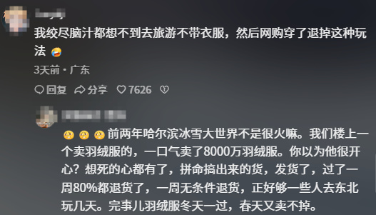 小到幼兒園文藝匯演買演出服洗都不洗一身臭汗直接寄回,大到高價羽絨服寄到景區旅遊穿完一身髒污無理由退貨,不僅白嫖好幾天免費新衣服還不用洗,有這腦子用在正道上好不好啊。