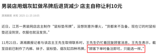 江蘇一男裝店店主爲防止惡意退貨,推出了鼠標墊、內褲、菸灰缸等多種樣式的‘吊牌’