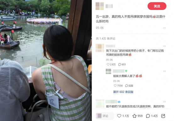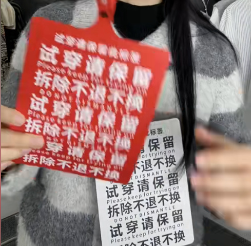 而巨型吊牌的好處,就是收到貨的發現不合身,貨不對板,料子不如預期等等情況,依舊可以正常去無理由退貨,主打的就是一個別想再穿着這件衣服出去白嫖,美美拍照後再退貨。