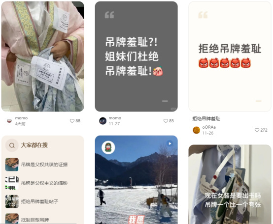 能夠做出以上這些行爲的,就不難理解爲什麼某平臺上突然就出現所謂“拒絕吊牌羞恥”、“巨型吊牌是父權主義”的帖子了。