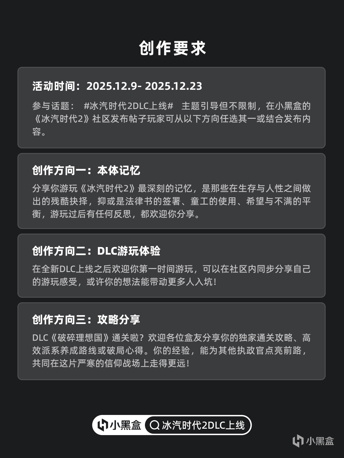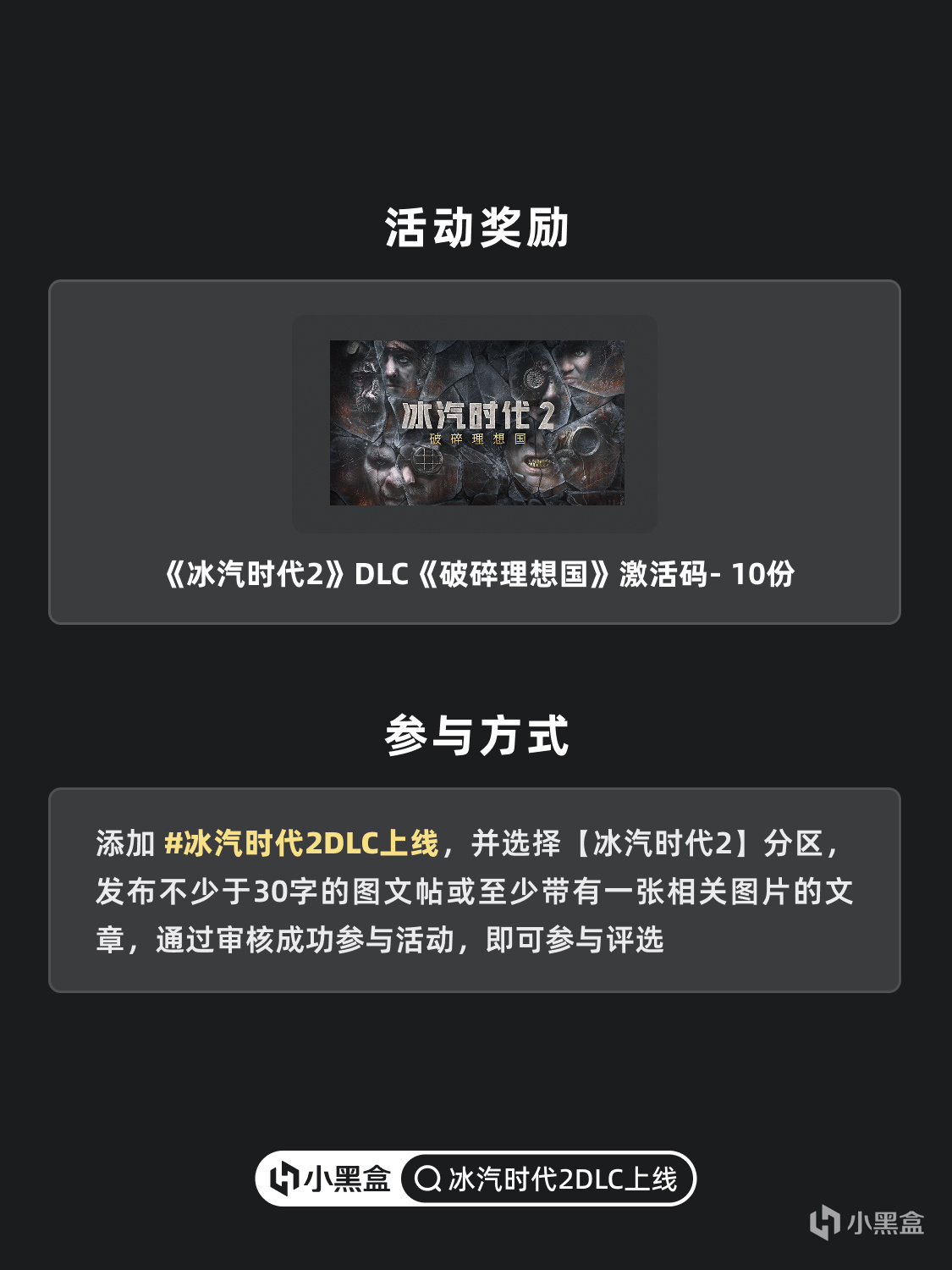 在小黑盒的冰汽时代2社区,携带#冰汽时代2DLC上线#话题,发布符合社区内容规范且与话题活动主题强相关的大于30字的图文或文章,通过活动审核即成功参与活动。 玩家可从以下三个方向任选其一或结合发布内容。