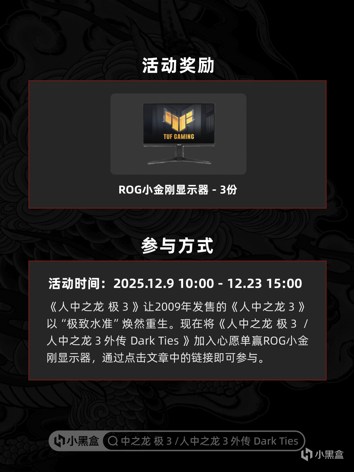 现在将《人中之龙 极3 / 人中之龙3外传 Dark Ties 》加入心愿单赢ROG小金刚显示器,通过点击文章中的链接即可参与。https://api.xiaoheihe.cn/store/roll_room_v2?award_id=5331