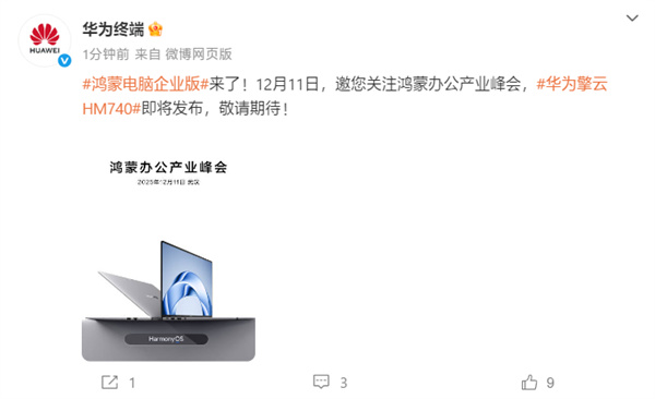 华为终端正式官宣,华为擎云HM740将于12月11日登场,定位是企业版鸿蒙电脑。