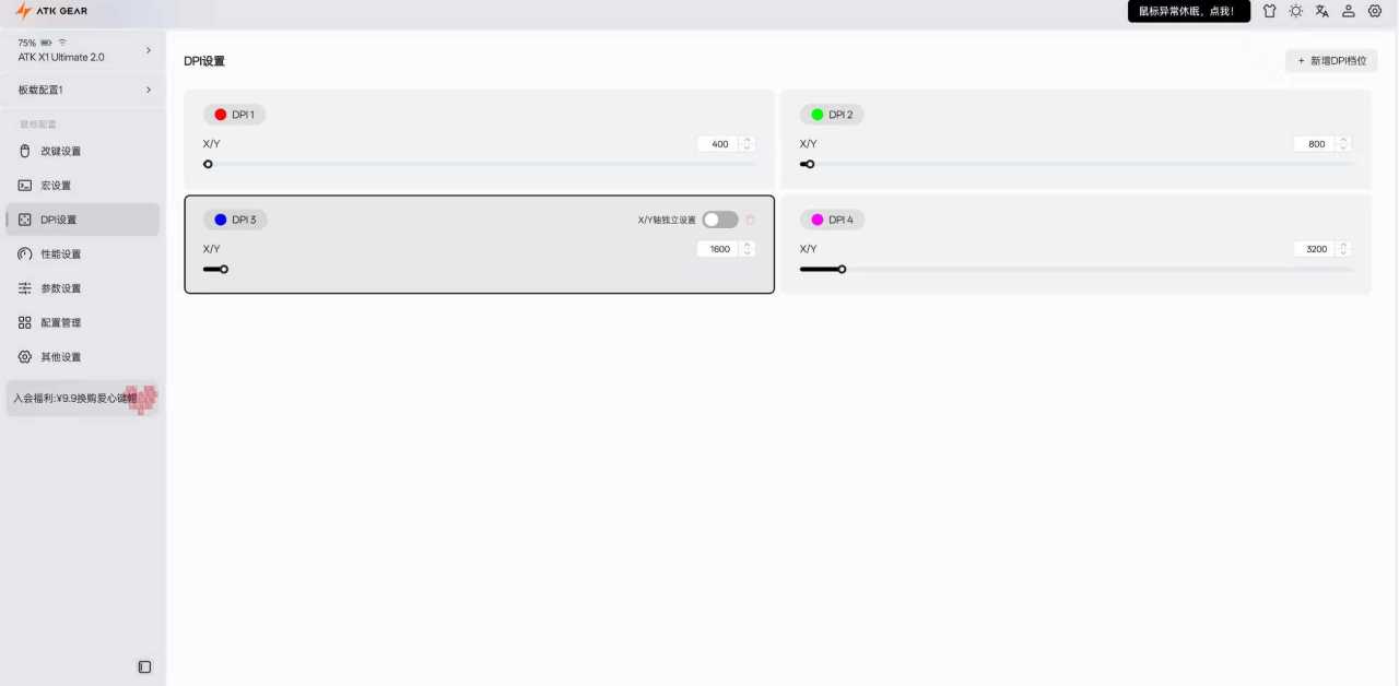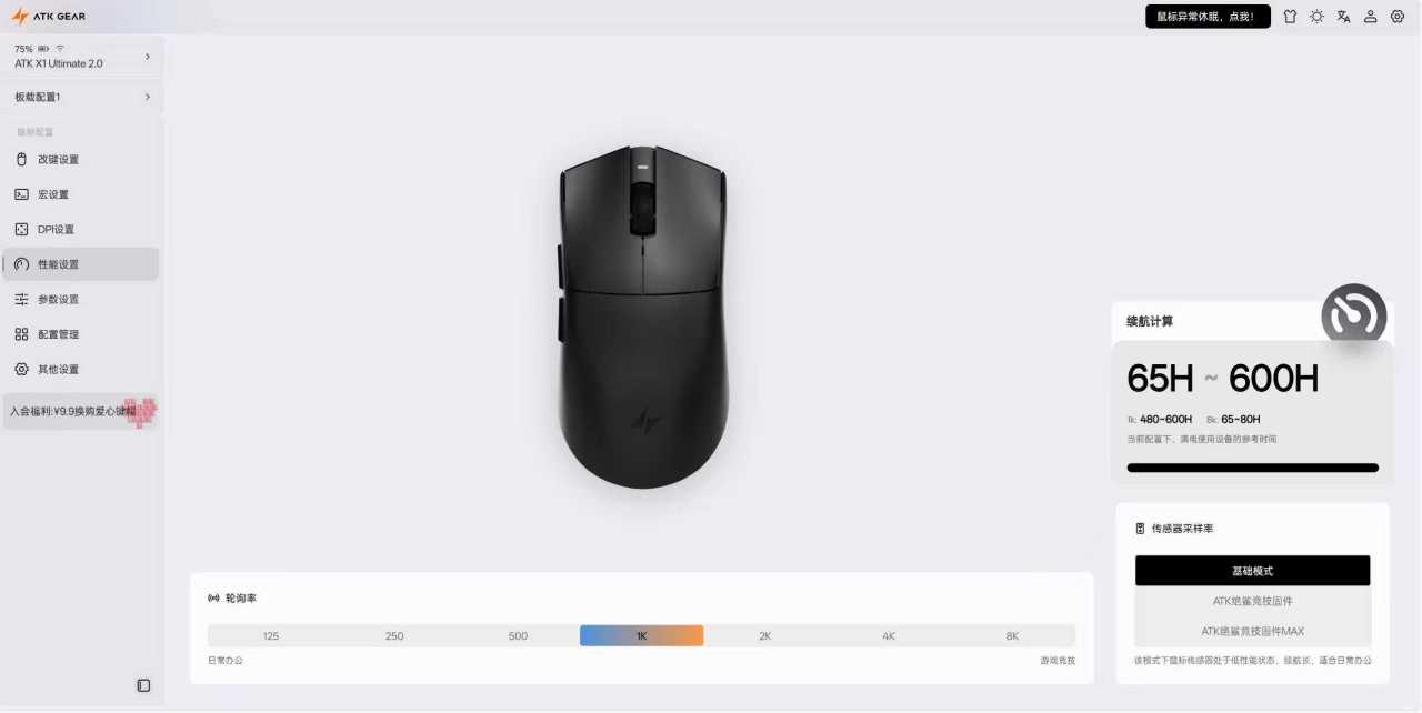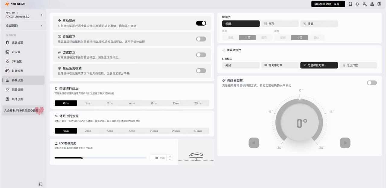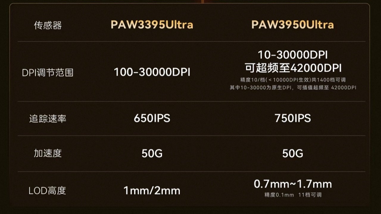 传感器也是非常之强的最旗舰PAW3950Ultra,DPI调节范围最高可超频至42000DPI,追踪速率750IPS,加速度50G,超强芯片+传感器