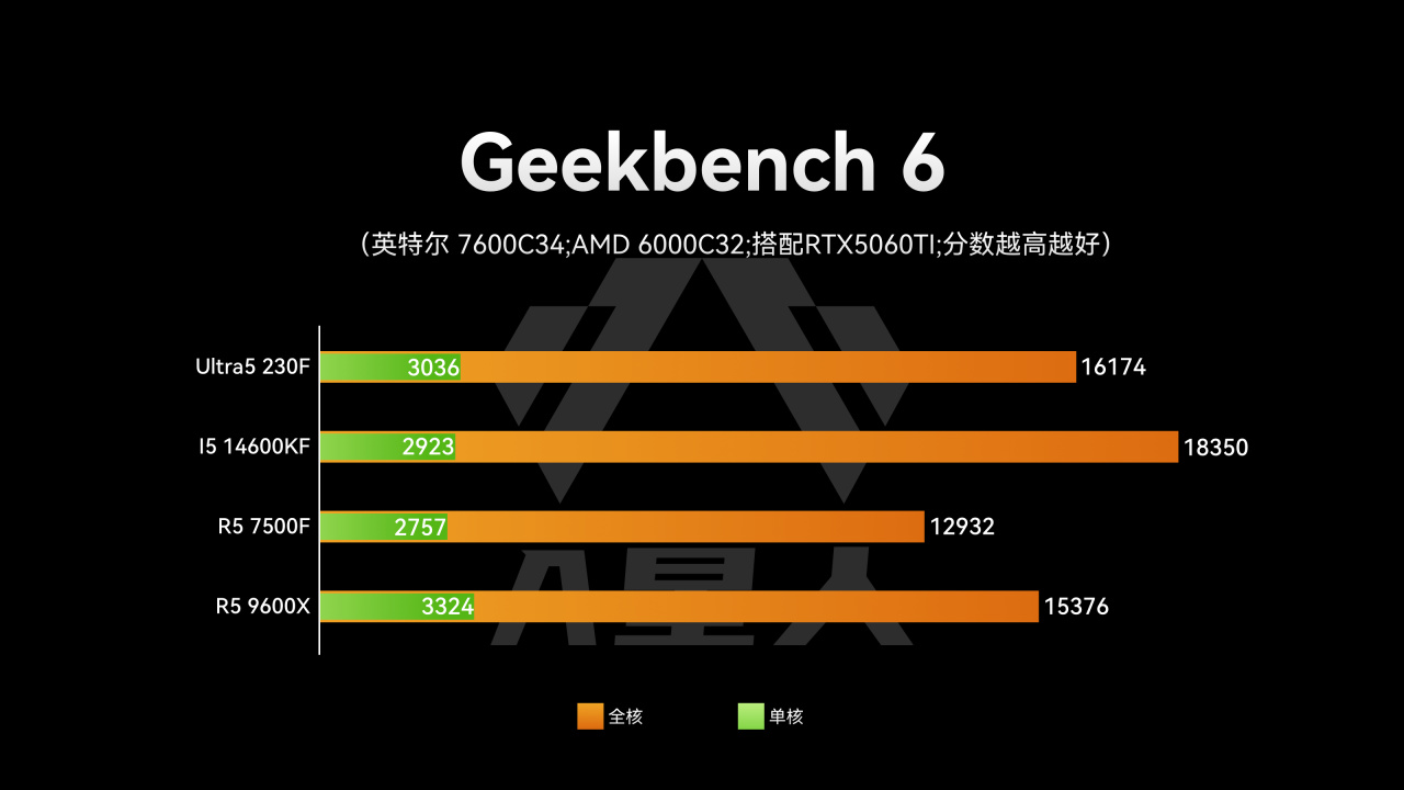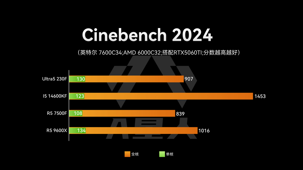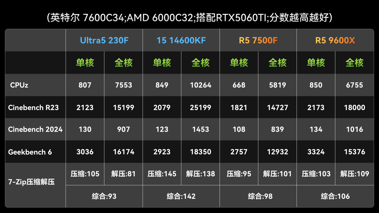 单核依旧是9600X领先,不过230F和14600KF的单核心也没差多少,多核跑分14600KF继续领先。