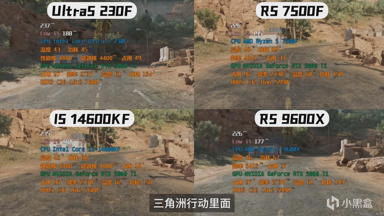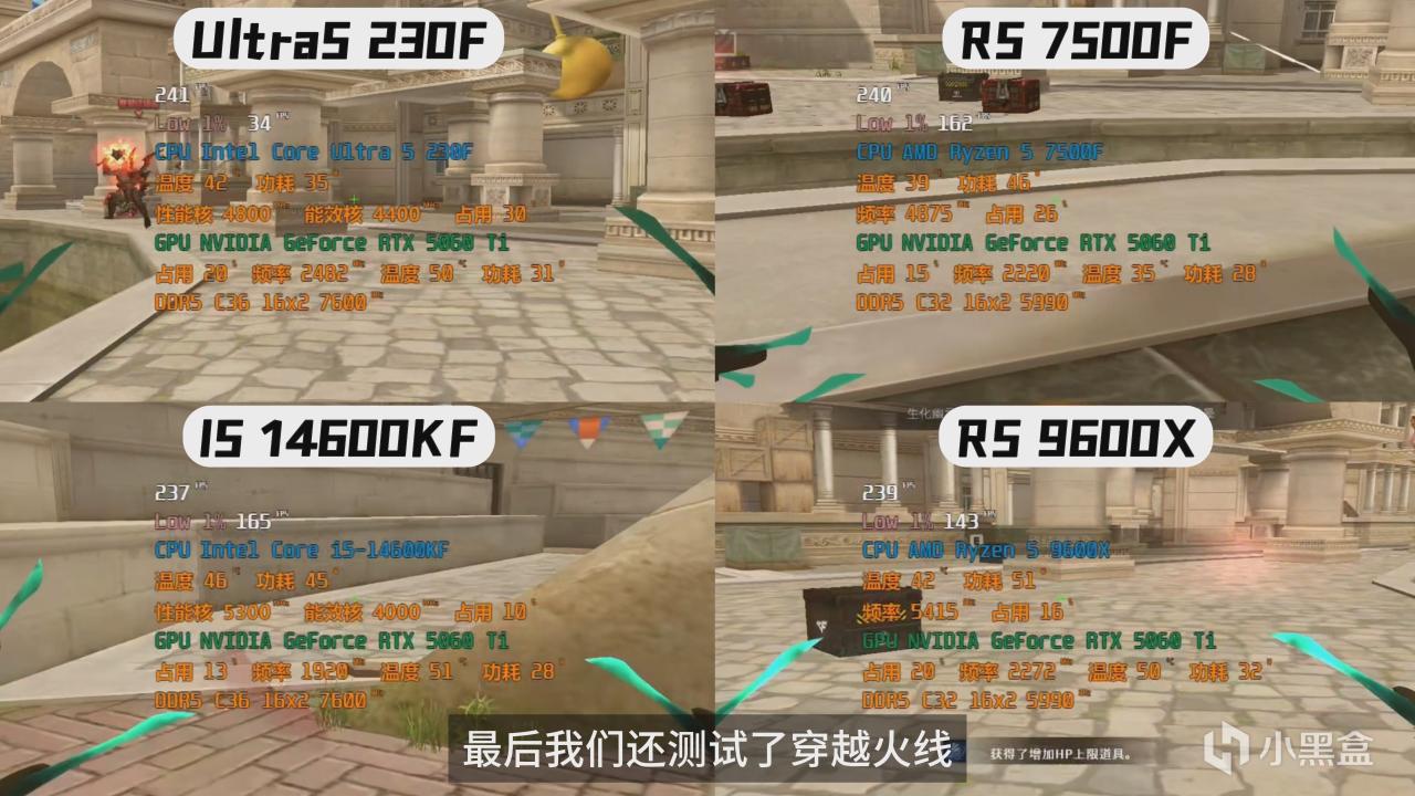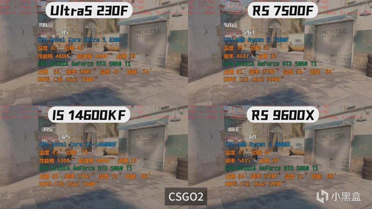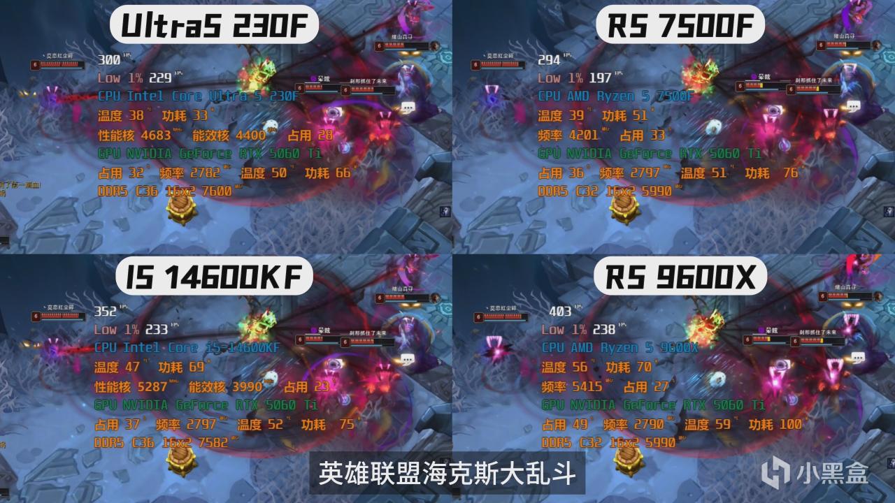 9600X的帧率表现最好,7500F和230F紧随其后,14600KF的就稍微落后一点。