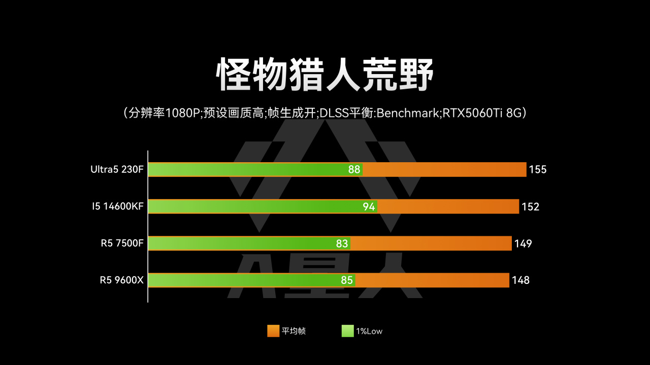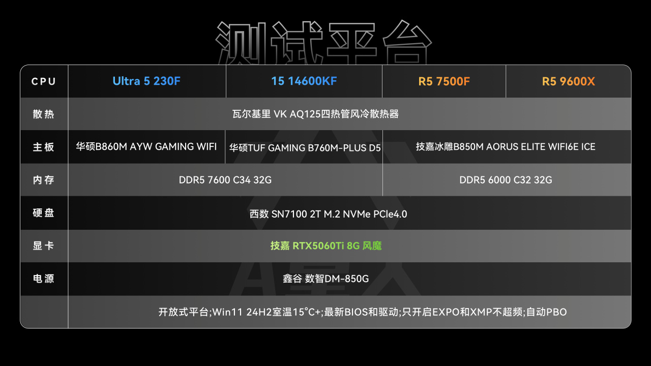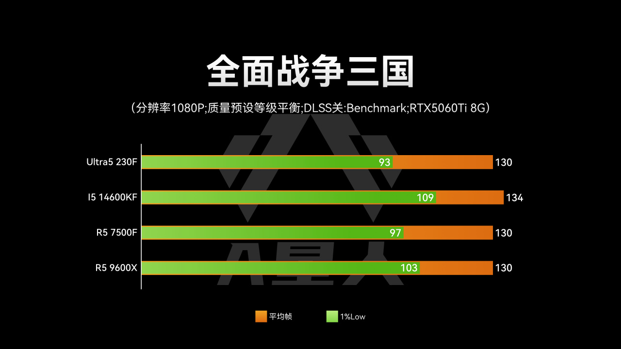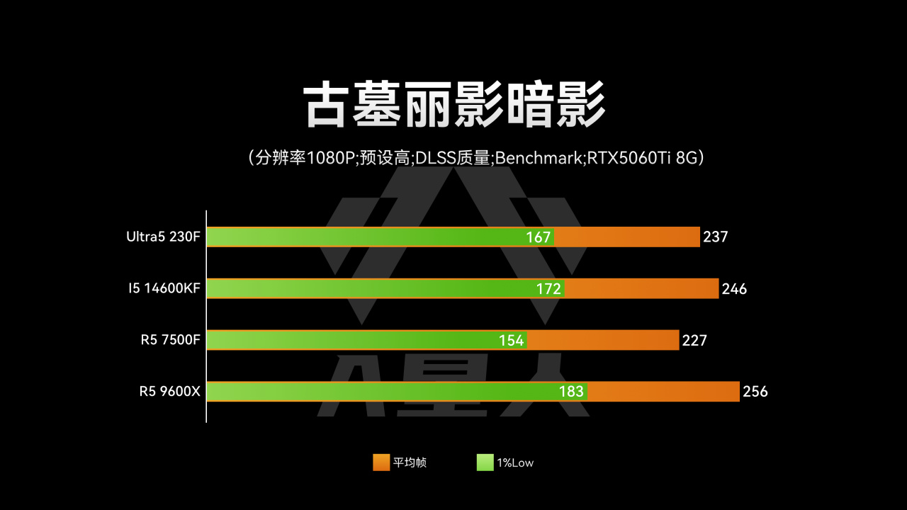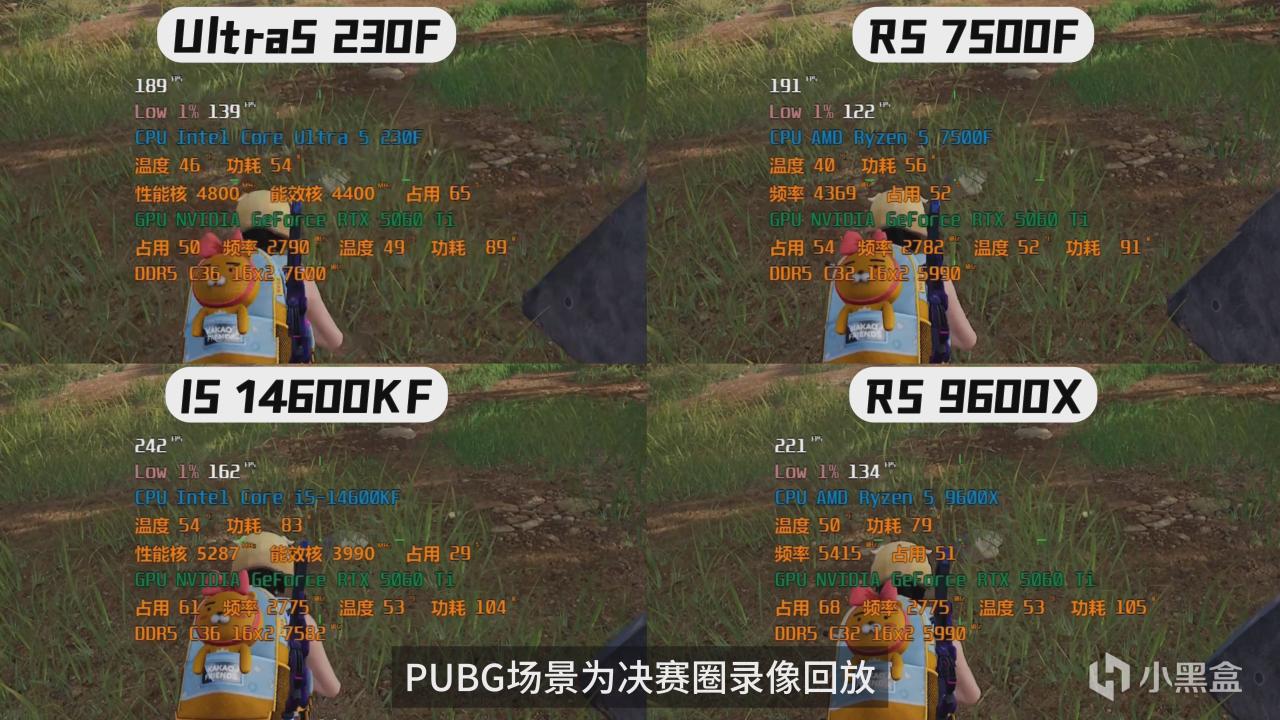 9600X的帧率表现最好,7500F和230F紧随其后,14600KF的就稍微落后一点。