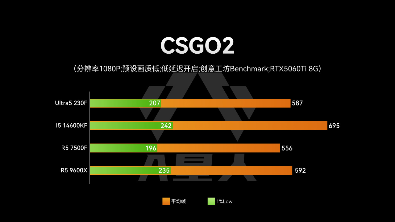 CS2中,14600KF表现非常强势 平均帧695,领先9600X 100帧 Low帧表现也是最高,在这个游戏里面,14600KF打赢了9600X,230F也打赢了7500F,纯粹的英特尔主场。
