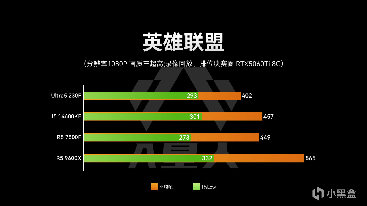 英雄联盟海克斯大乱斗,现在这个模式也是非常火爆,9600X凭借优秀的单核性能,平均帧565表现最好,英特尔两款CPU表现也不错,都有400(平均帧)+300(1%Low)的表现。