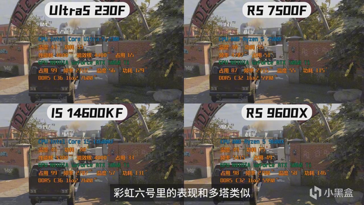 彩虹六号里的表现和多塔类似,同样是9600X平均帧领先,但是Low帧表现最好的还是14600KF,表现最差的依旧是230F。