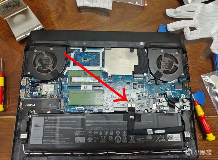 看到主板后,第一件事:找到电池连接主板的排线,拔掉它!