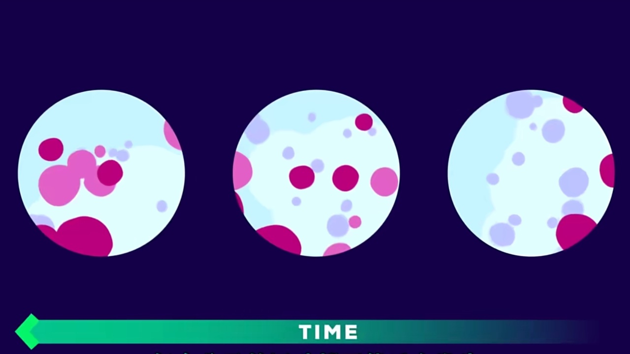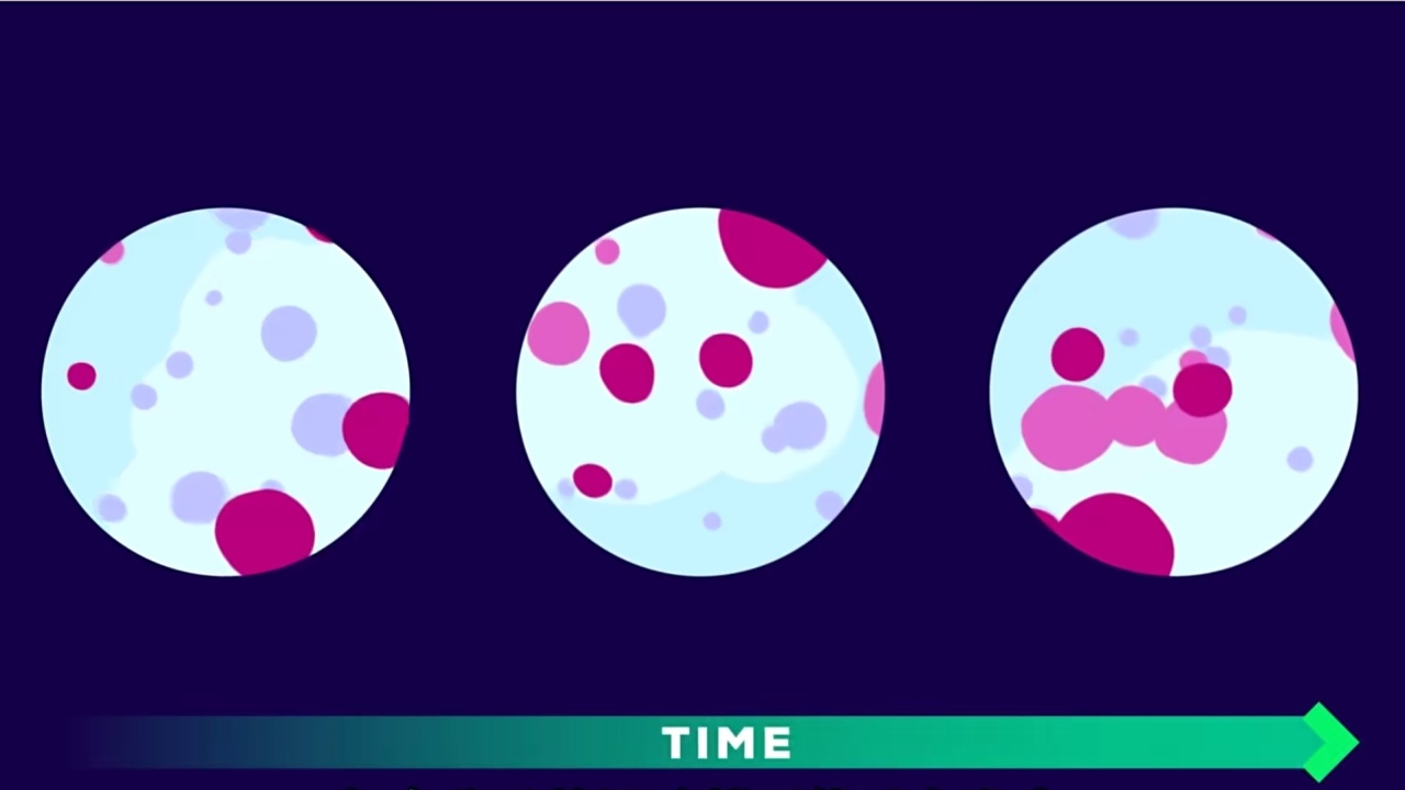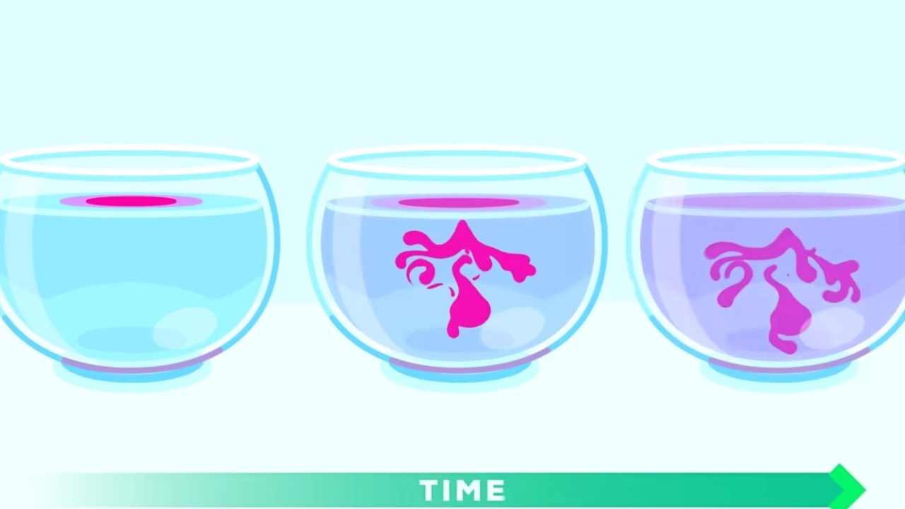 在我们理解的“常识”下,这是肯定的,水会变红,时间是会把有序的事物变得无序。但是在显微镜下不是这样,每一个颜色颗粒都在无规则的做着运动,它们熙熙攘攘,扩散开去。