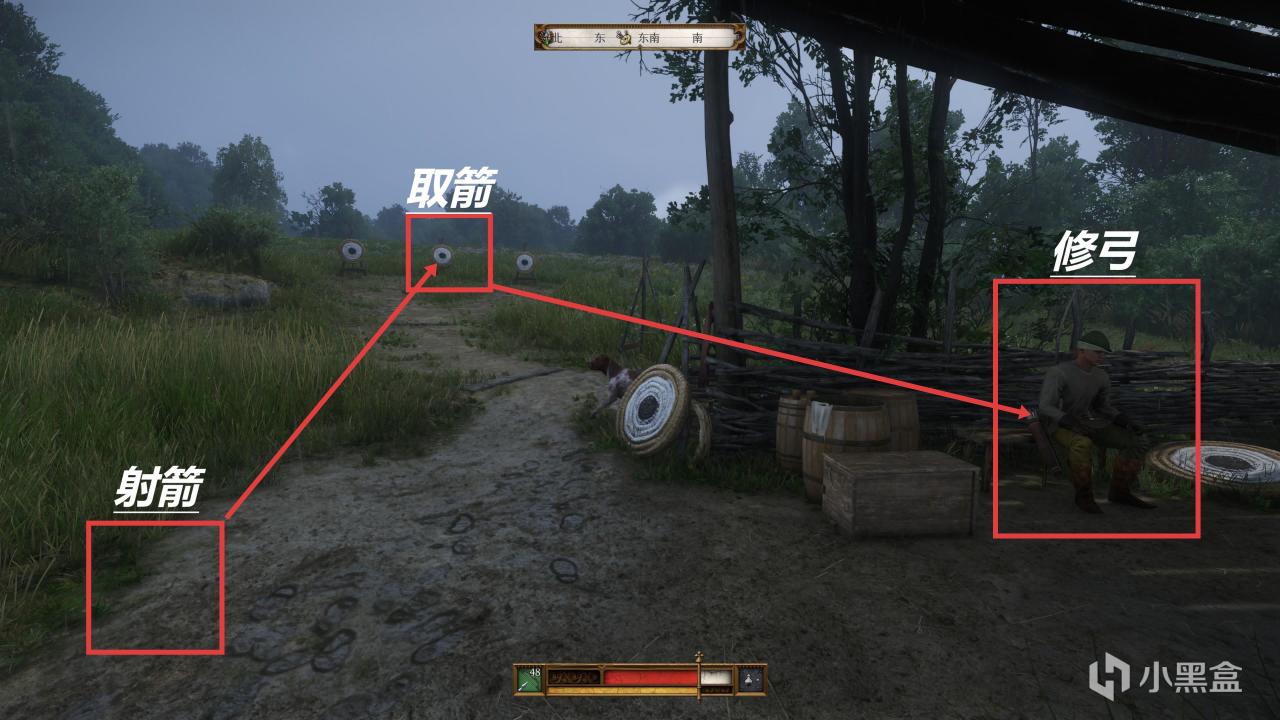 去下图位置或者随便一个有靶子的射击场射箭,先把箭射到靶子上,等弓耐久快用完了,去靶子上拔箭+找NPC修弓(当然也可以选择参加射箭比赛)
