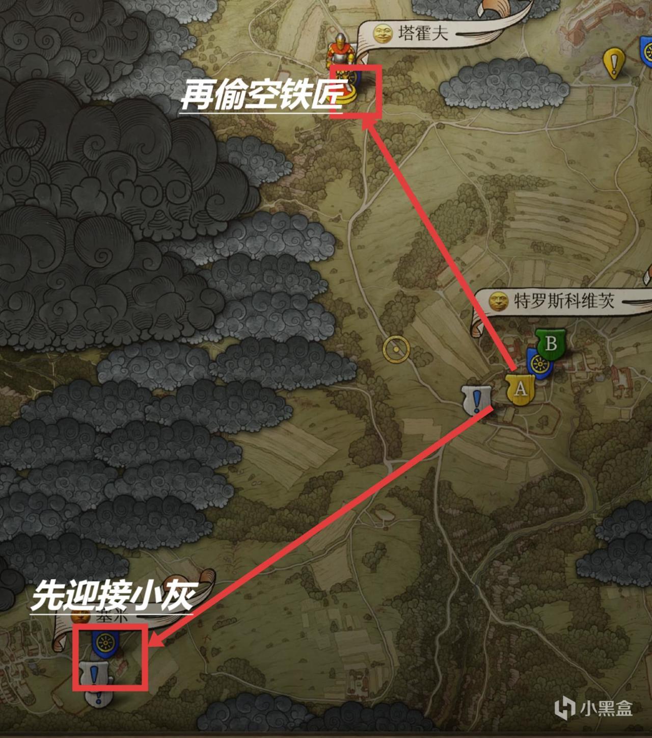 接下来我们跟着主线标记去找铁匠,先简单跟铁匠对下话拿到小屋的使用期限,再按照下图位置去撬困锁偷装备;如果开局营地对话选了盗窃最好,没有的话喝一瓶亨利级巧手药剂,撬开直接搬空,启动资金get!