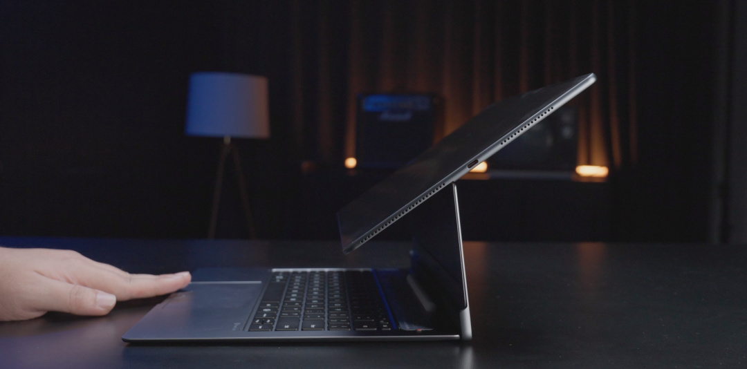 我们一开始看到宣传海报的时候,还以为这上面是两台设备,一台带了个折叠支架,另一台则配了悬浮一体式键盘。