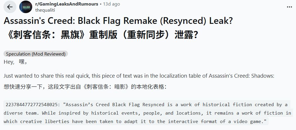 PEGI條目出現前,最新細節源於《刺客信條:影》更新文件的數據挖掘。本地化文件中發現明確提及項目名稱的文本:"《刺客信條:黑旗 重鑄版》是由多元化團隊創作的歷史虛構作品。雖受歷史事件、人物與地點啓發,本作仍爲虛構作品,創作者已採取藝術自由以適應視頻遊戲的互動形式。"該措辭與《刺客信條》系列正式作品常見的免責聲明高度吻合。