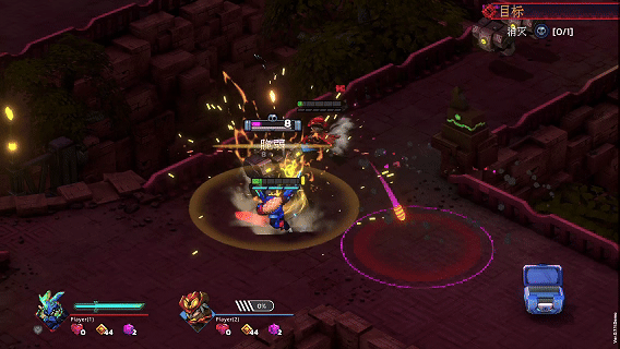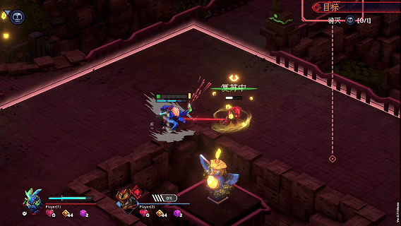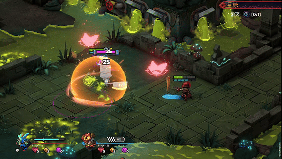 战斗房间的目标是击杀分布在地图各处的精英怪/BOSS怪,画面会有方向提示指路。精英怪自带护盾,需要破盾之后才能造成伤害。破盾期间,怪物处于硬直状态,受到伤害更高。随后,怪物盾会自动恢复。