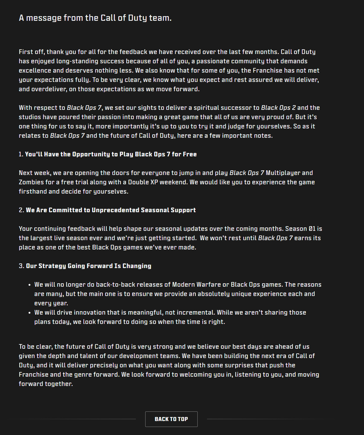 關於《黑色行動7》,我們的目標是打造一款《黑色行動2》的精神續作,工作室已傾注所有,致力於製作一款讓我們所有人都感到非常驕傲的優秀遊戲。但我們自己說好是一回事,更重要的是由你們親自嘗試並做出評判。因此,關於《黑色行動7》以及《使命召喚》的未來,以下是幾點重要說明。