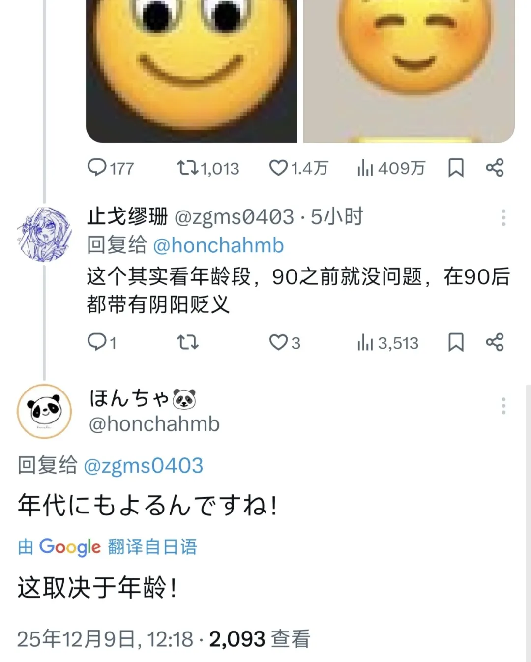 然後又中國網友解釋說:沒關係,這個表情如果是90後發的就是在陰陽怪氣,但如果是90年之前生人的人發,就是在表示友善。