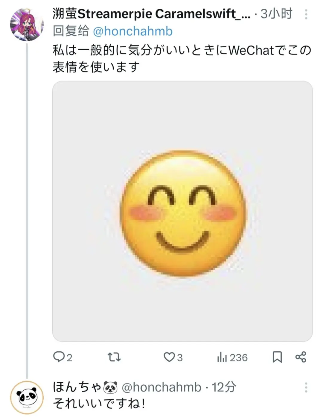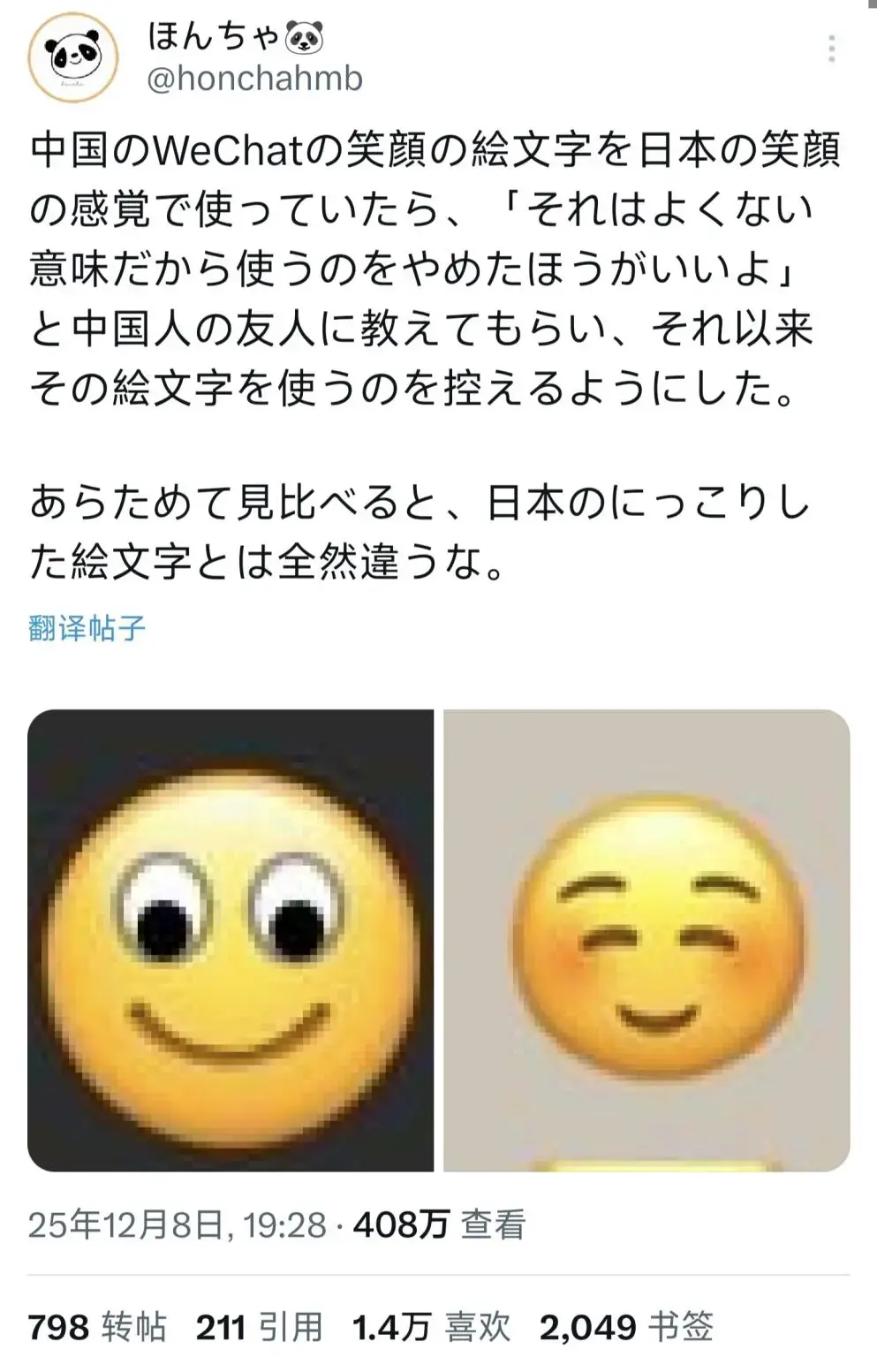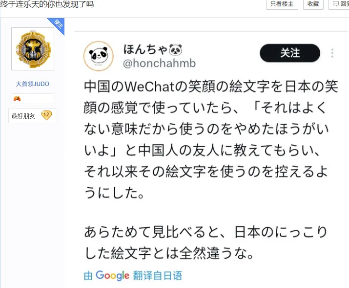 翻譯:當時我跟中國朋友聊天發了微笑的表情,但是他告訴我個表情有不好的含義。我仔細觀察了下日本軟件自帶的微笑表情,兩者好像確實不一樣。