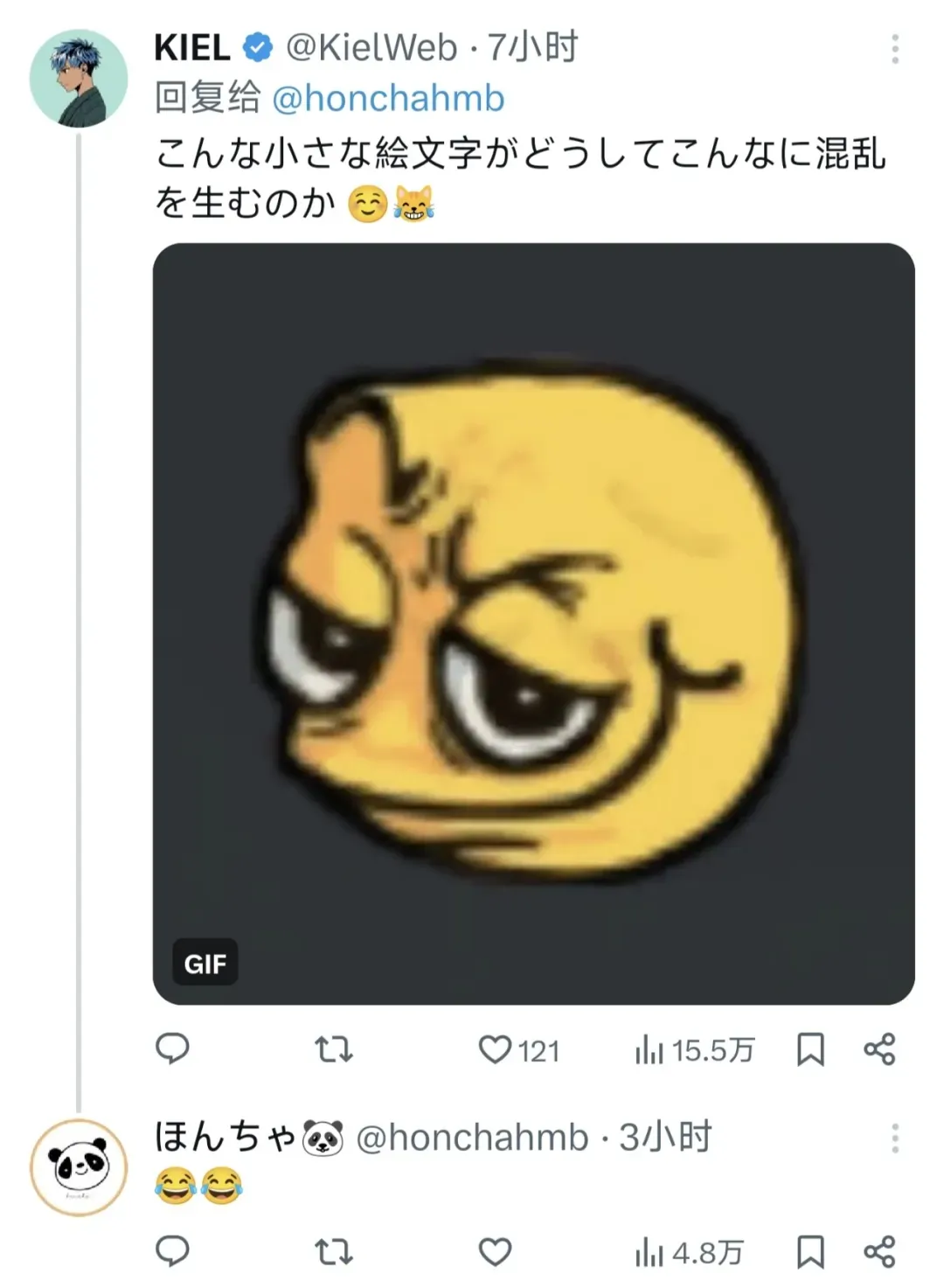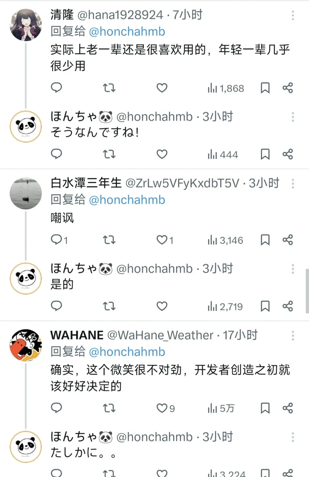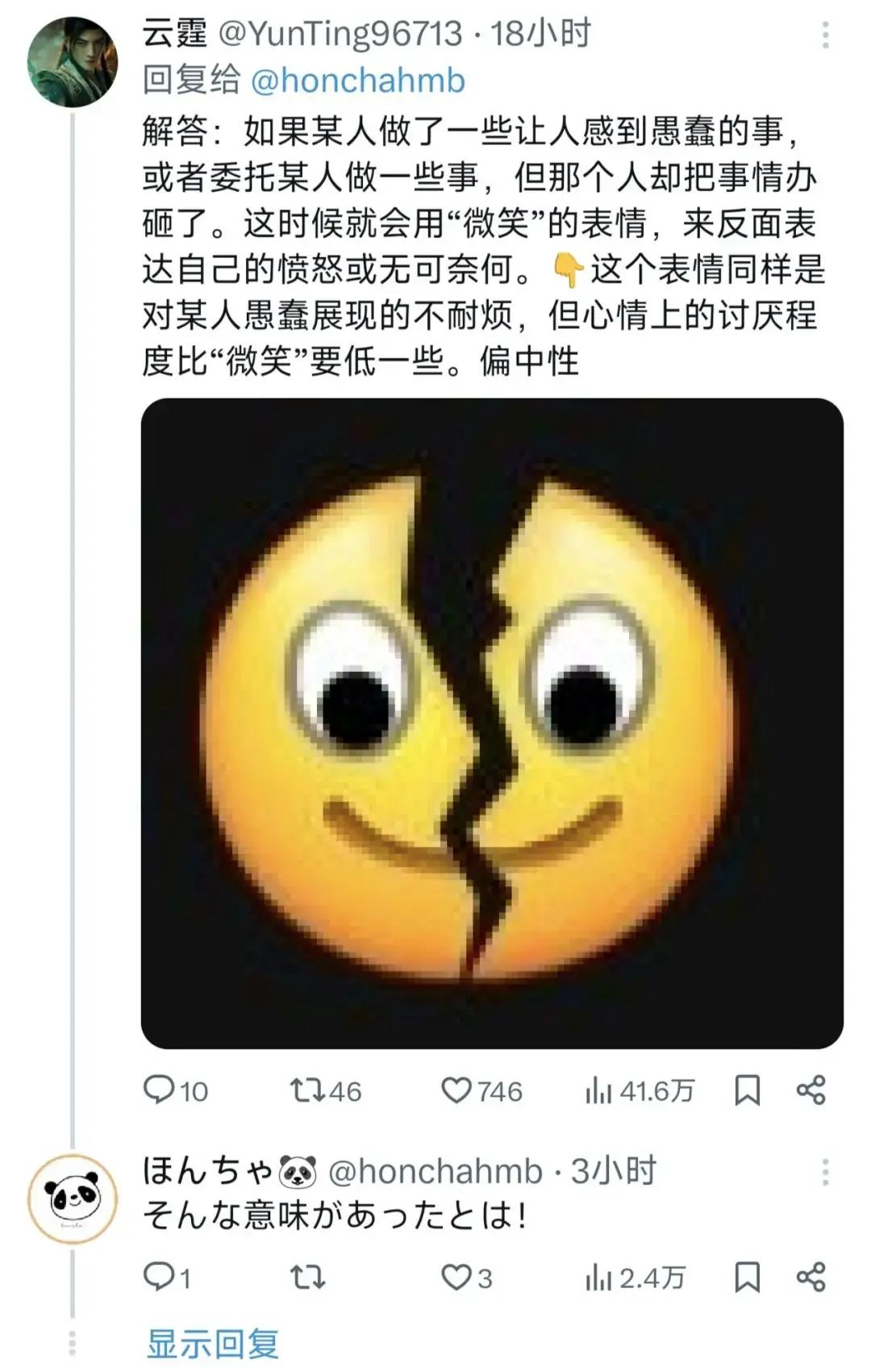 然後還有中國的網友給這位日本推主做了延伸科普,告訴他如果有人給你發裂開了的微笑,看起來更嚴重,但其實“無奈”的意思更多一點,心情的討厭程度沒有“微笑”那麼高。