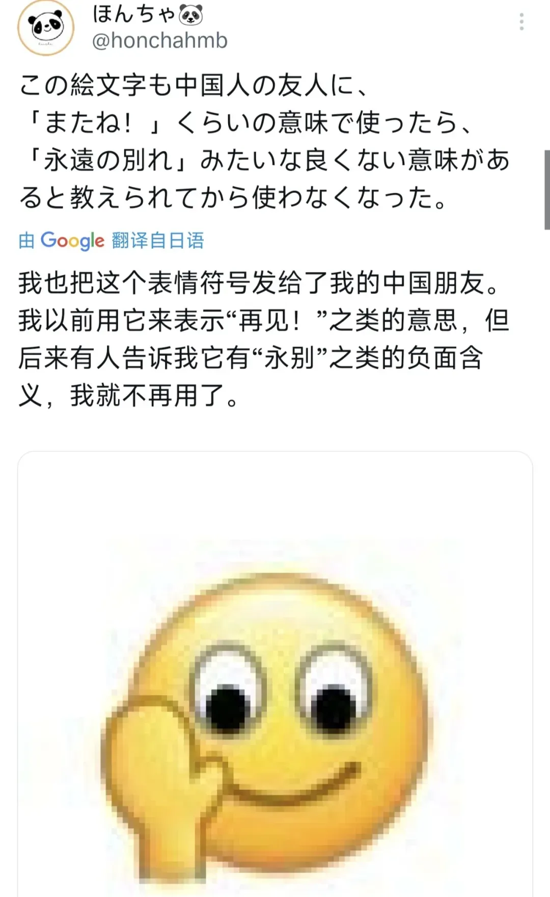 現在這個日本推主,已經開始研究別的表情包了,比如“再見”,他表示這個看起來普通的表情包,實際上有“永別”的意思。