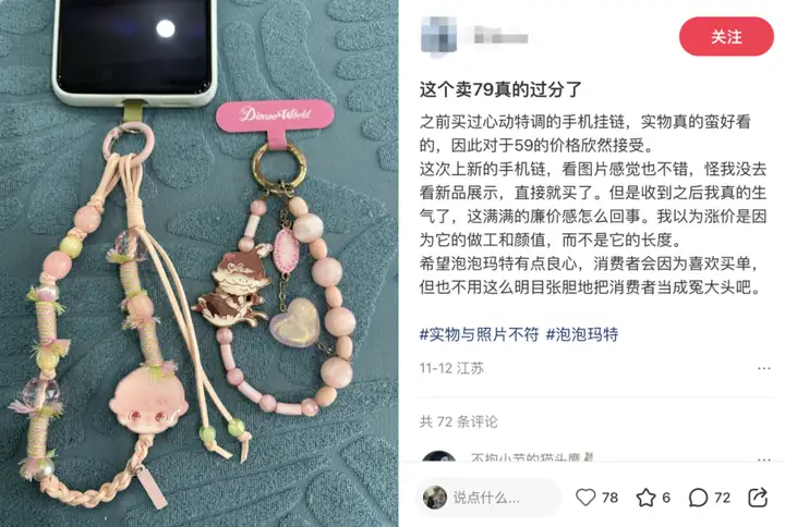 上個月的11月6日,泡泡瑪特直播間工作人員展示售價79元的DIMOO掛鏈盲盒時,一人脫口而出“哎,這東西賣79(元)確實有點貴”,另一人回應“沒事會有人買單的”。這段對話被實時播出,導致粉絲們強烈不滿,同時也引發了很多人對於泡泡碼頭產品高價的質疑。